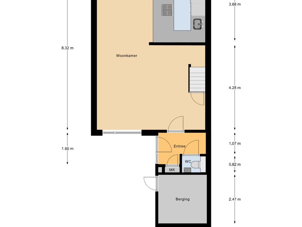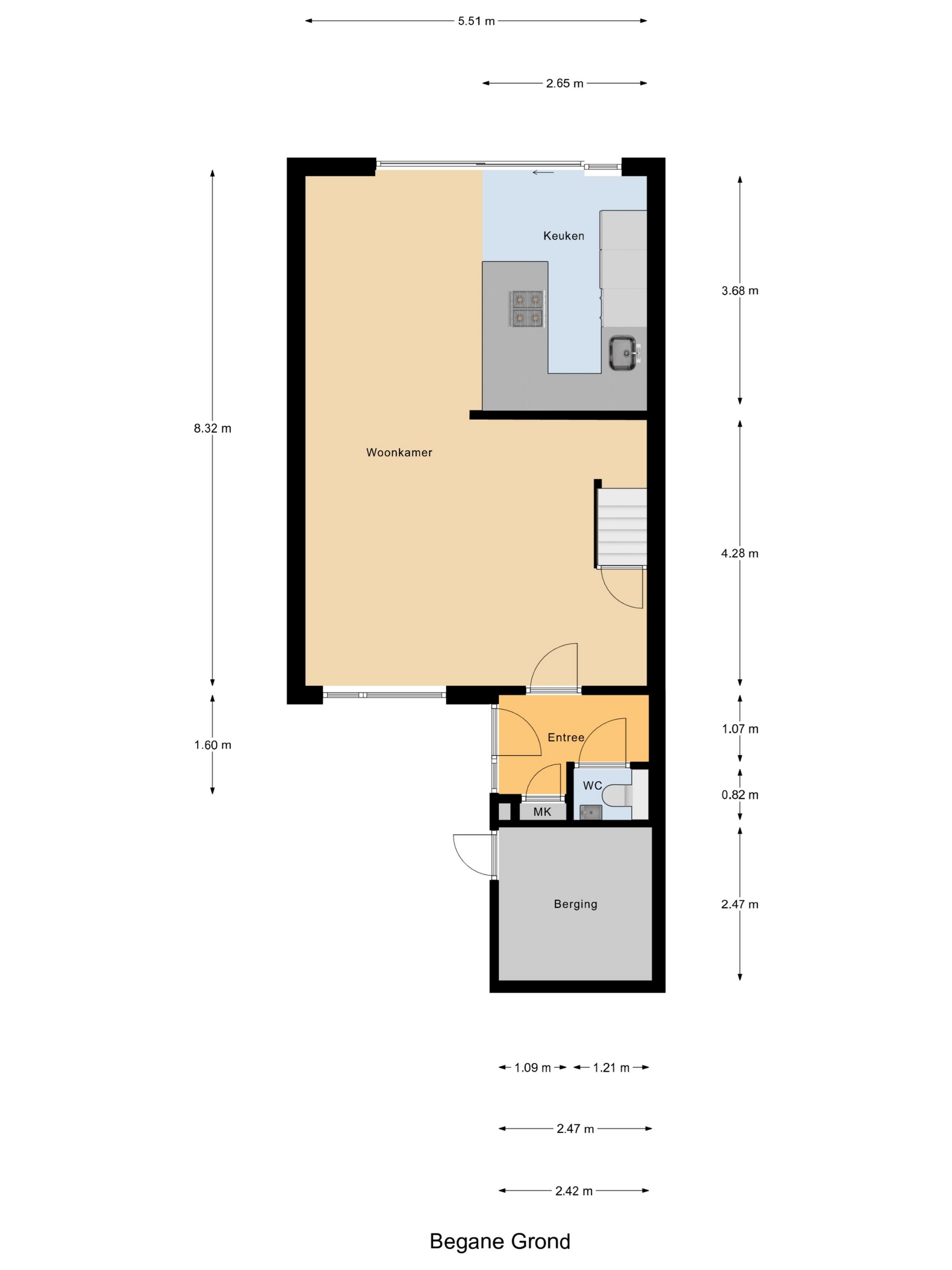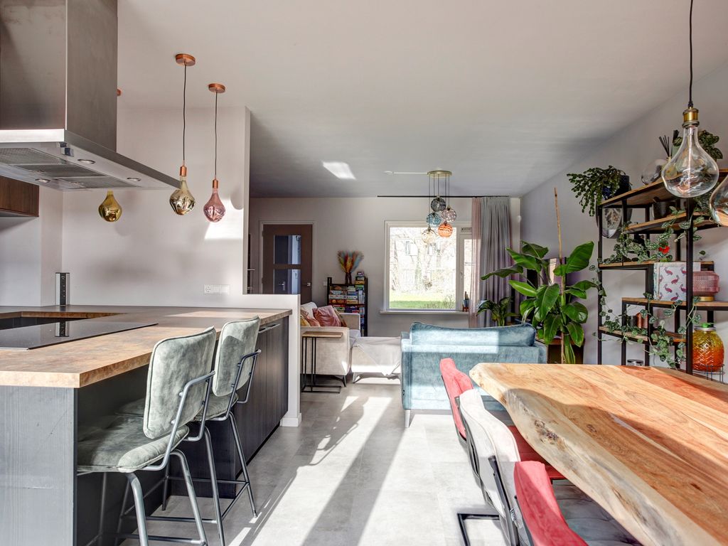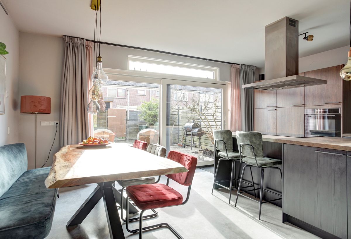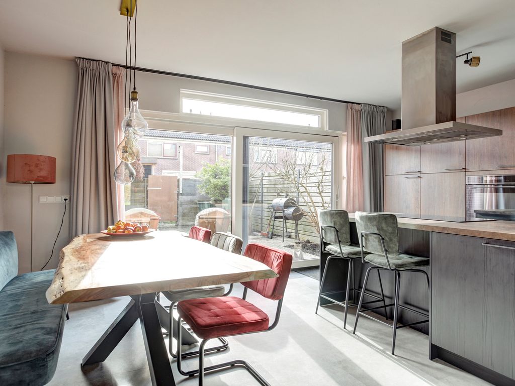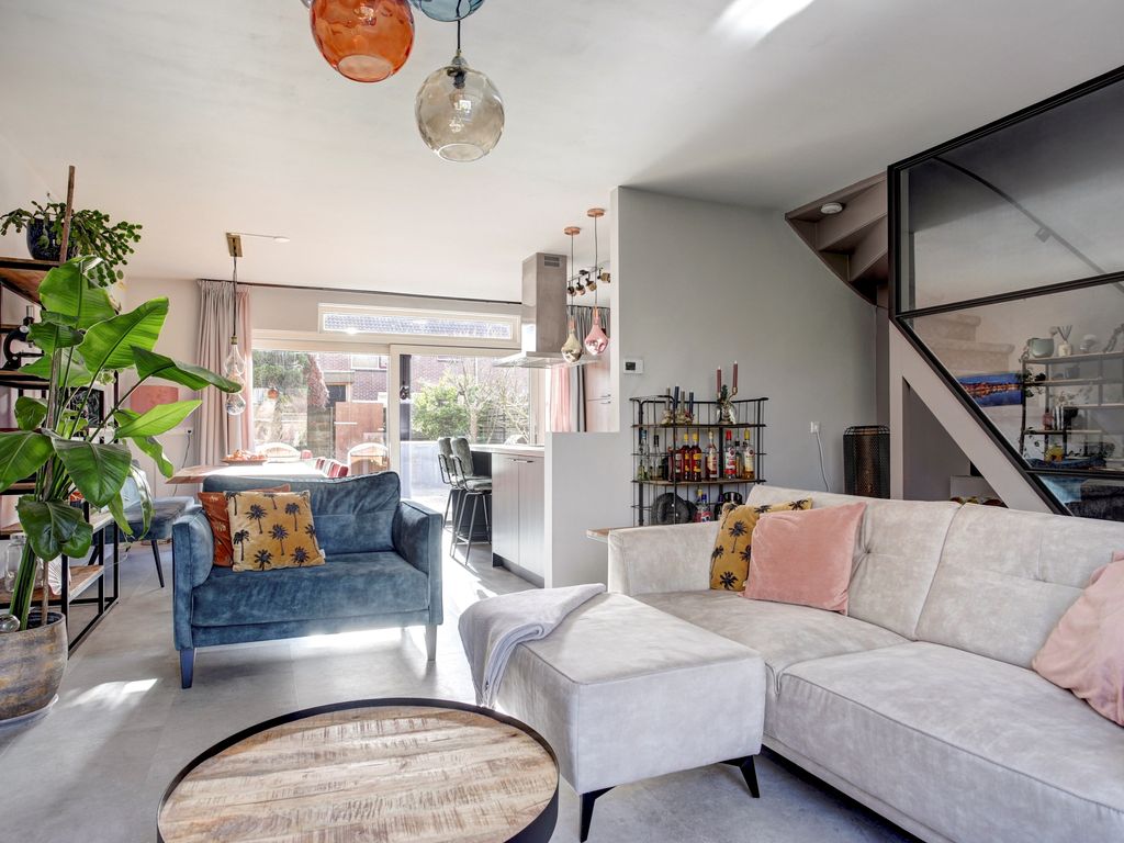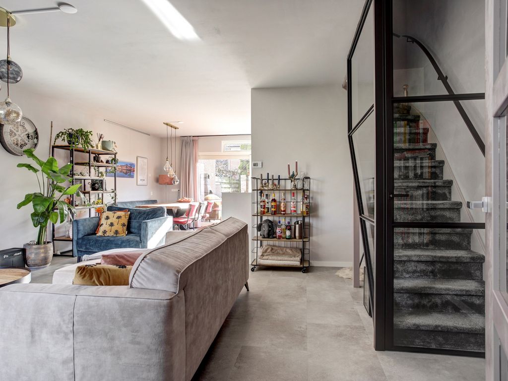 entree/hal met meterkast en toegang tot het toilet. Het toilet is voorzien van een hangcloset en fontein. De woonkamer is gelegen aan de voorzijde en heeft een groot kozijn (HR+++ glas) voor veel lichtinval. De echte eyecatcher is toch wel de stalen trapombouw. Deze hebben ze ook in 2022 laten aanbrengen. De keuken ligt aan de achterzijde en heeft door de brede schuifpui een mooi uitzicht over de achtertuin. De keuken, in een u-opstelling, is voorzien van diversen inbouwapparatuur en heeft een klein barretje met plek voor twee krukjes. De gehele begane grond is in 2022 voorzien van vloerverwarming. De achtertuin is bereikbaar middels de grote schuifpui in de keuken en achterom. Hij is gelegen op het zuidwesten en is voorzien van bestrating en groen. Ook is er een groot zonnescherm aanwezig op de achtergevel om op de hete zomerdagen het zonnetje buiten te houden.