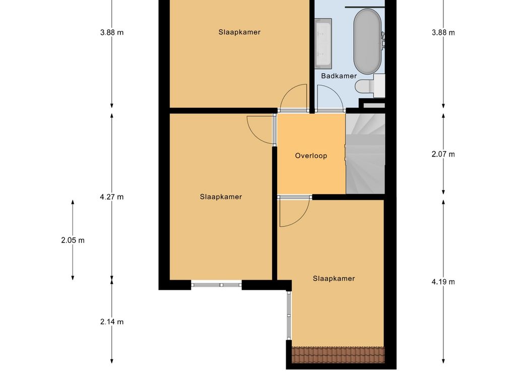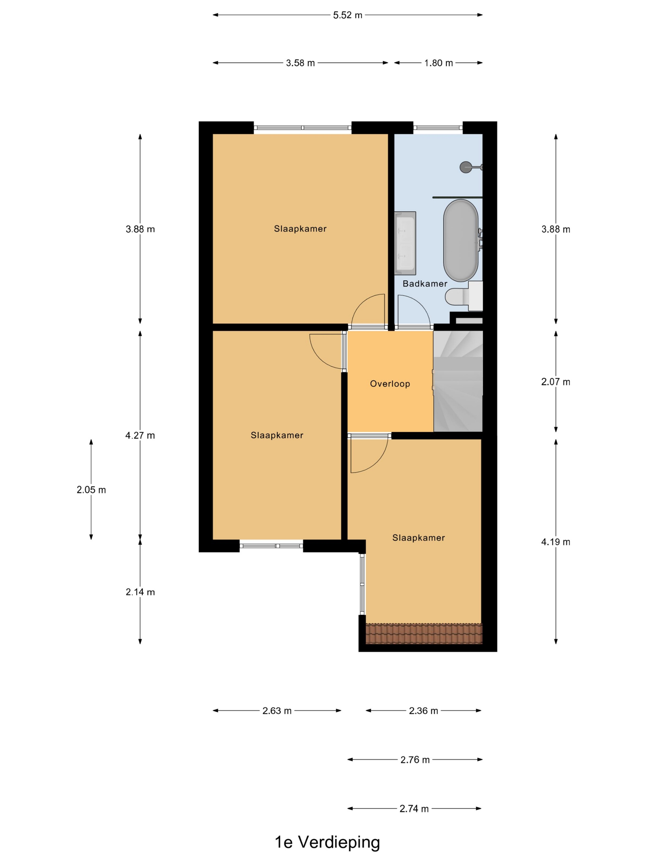 Op de eerste verdieping zijn drie slaapkamer en een badkamer aanwezig. De badkamer is in 2022 vervangen voor deze modern ingerichte badkamer. Hij is van alle gemakken voorzien. Elektrische vloerverwarming, ligbad, inloopdouche met draingoot, hangcloset en een dubbel wastafelmeubel. De slaapkamer aan de achterzijde heeft een airco unit, zonnescreen en HR+++ glas.